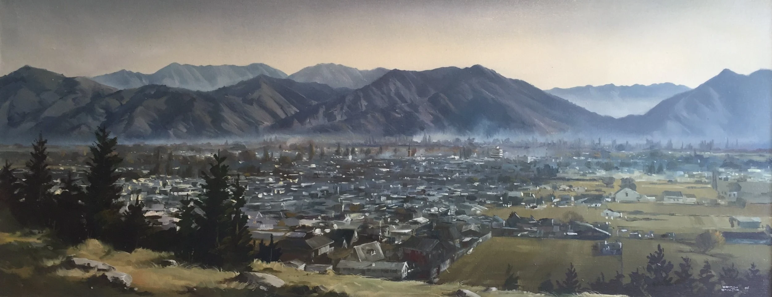 This large painting of the Richmond Ranges from across Blenheim was presented to the original Blenheim Civic Theatre when it was opened in Arthur St circa 1984. It now hangs in the new ASB Theatre in Hutcheson St Blenheim.